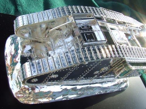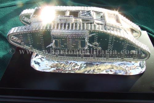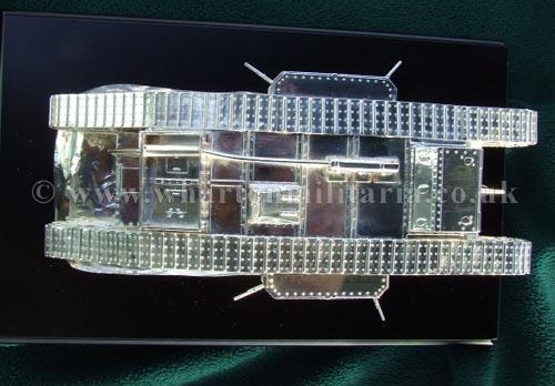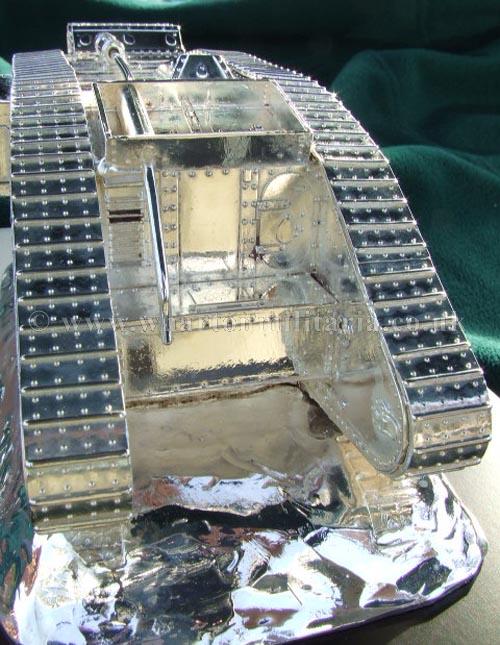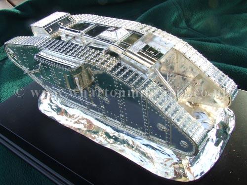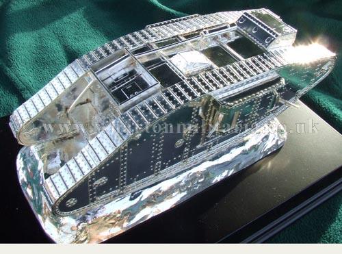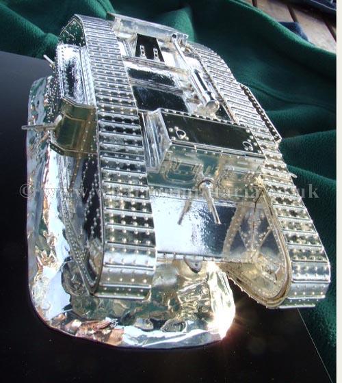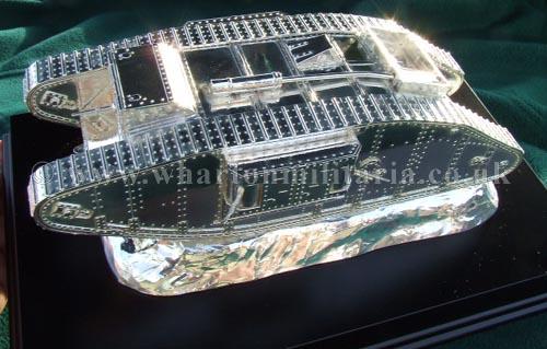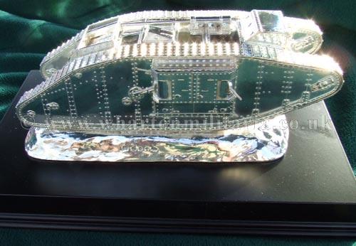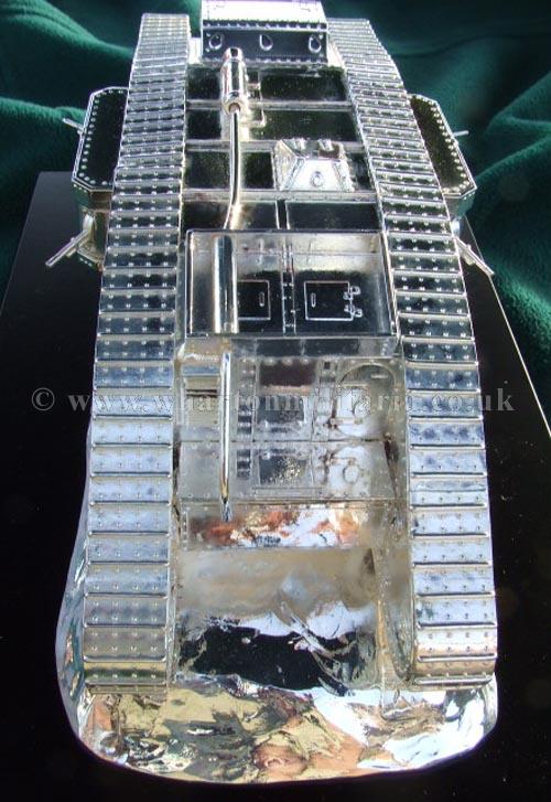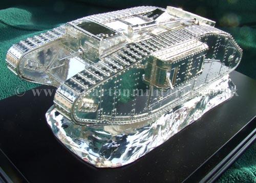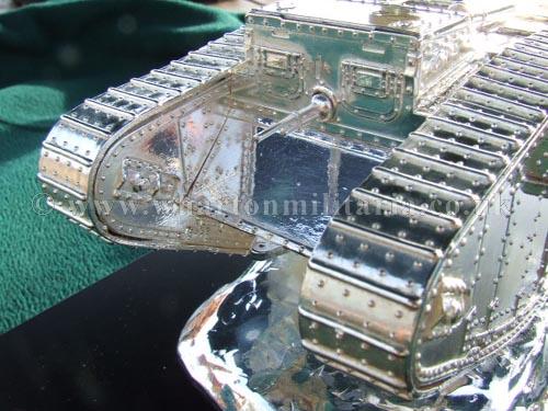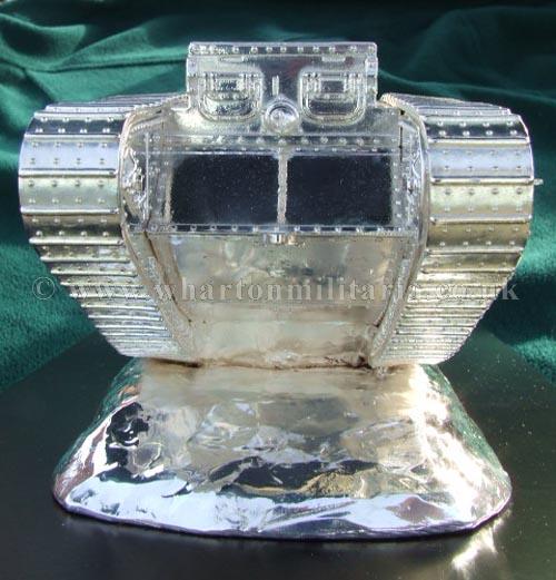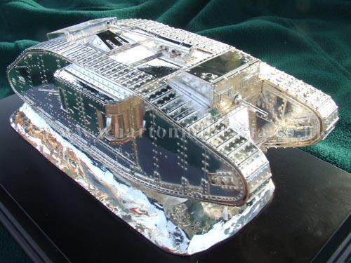 A beautiful hallmarked sterling silver mess table piece of a MkIV female tank, this silver model is the finest silver WW1 tank made to date. The tank is an awesome 9 inches by 4 inches approx and extremely detailed. This tank was specifically made for the Royal Tank Regiment mess table. Pictures show the tank on the table of Government House.