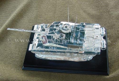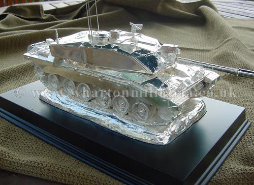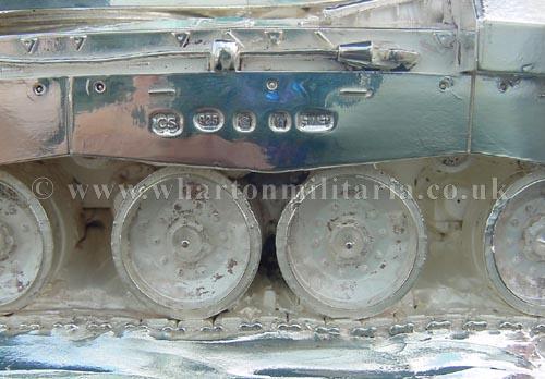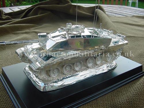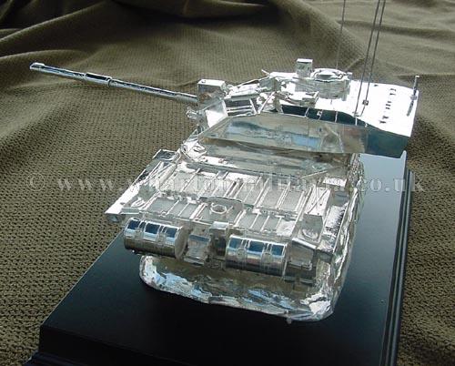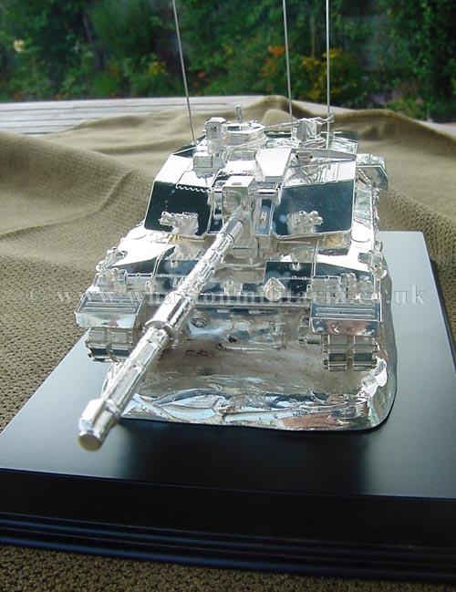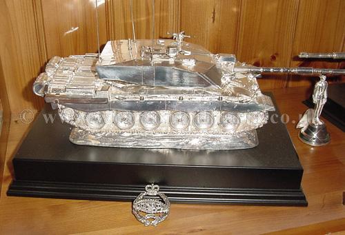 A beautiful hallmarked sterling silver mess table piece of a Challenger 2 tank, this silver model is the finest silver Challenger 2 tank made to date. The tank is an awesome 14 inches approx in length and extremely detailed. This tank was specifically made for the Royal Tank Regiment mess table. Pictures show the tank on the table of Government House.