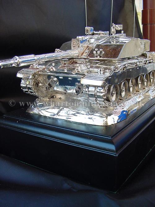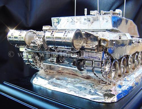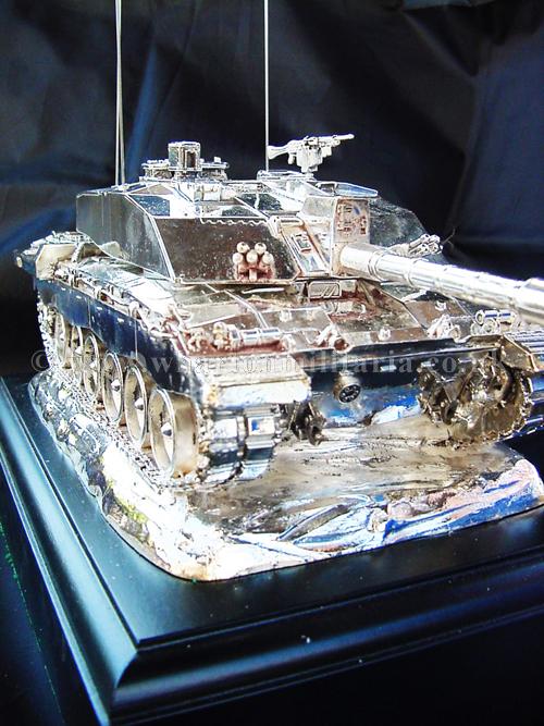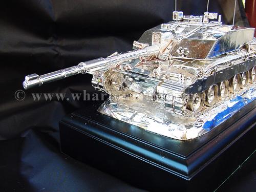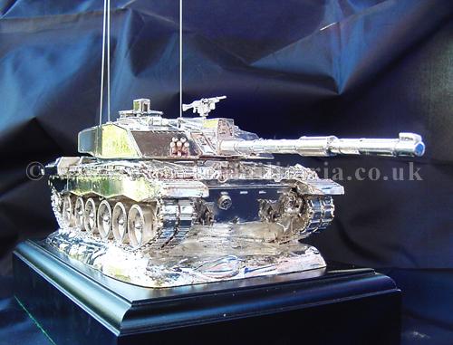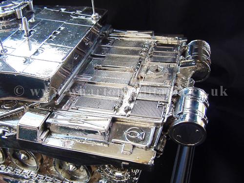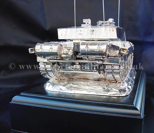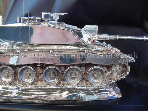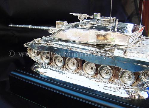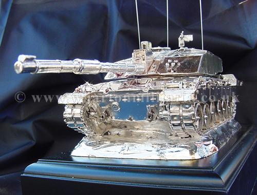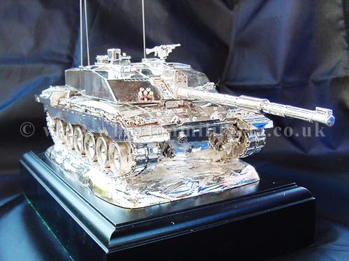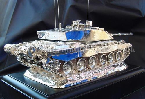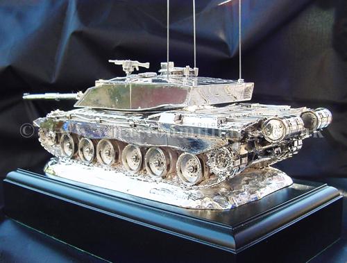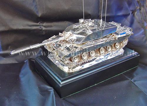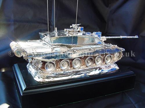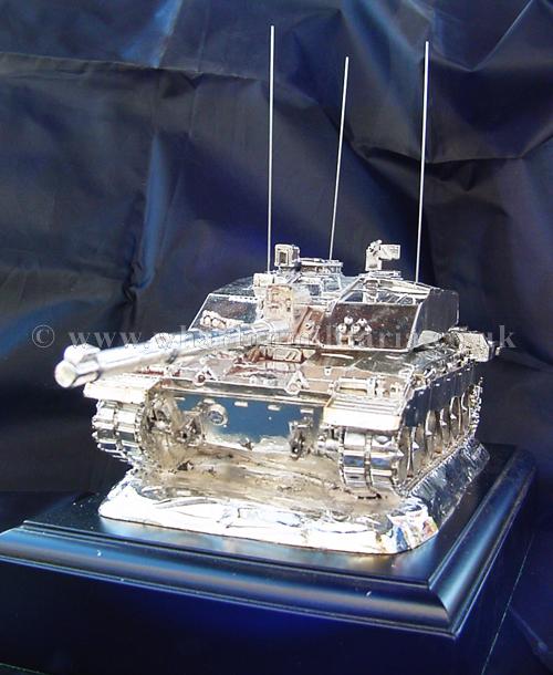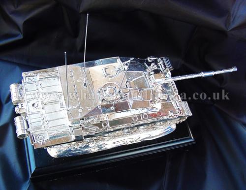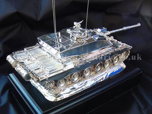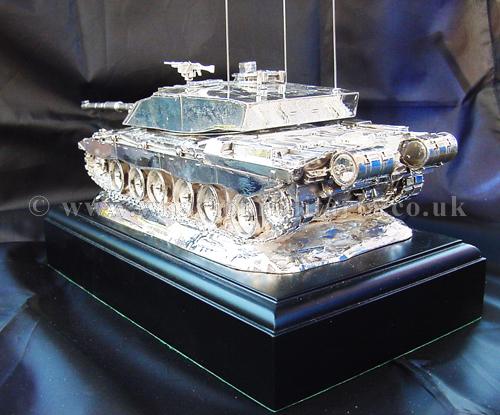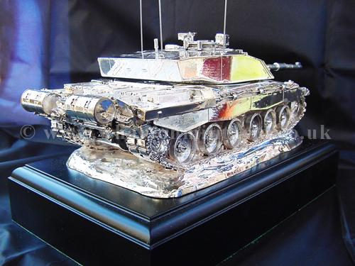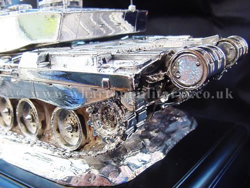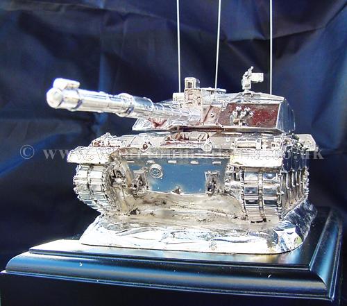 A beautiful hallmarked sterling silver mess table piece of a Challenger 2 tank, this silver model is one of the finest silver Challenger 2 tank made to date. The tank is an awesome 14 inches approx in length and extremely detailed. This tank was specifically made for the Royal Tank Regiment mess table.