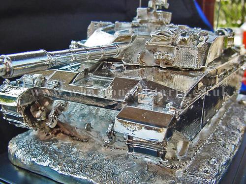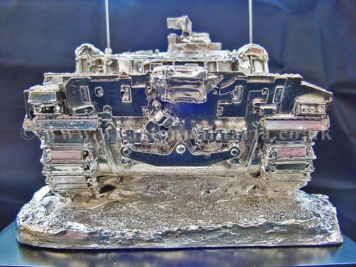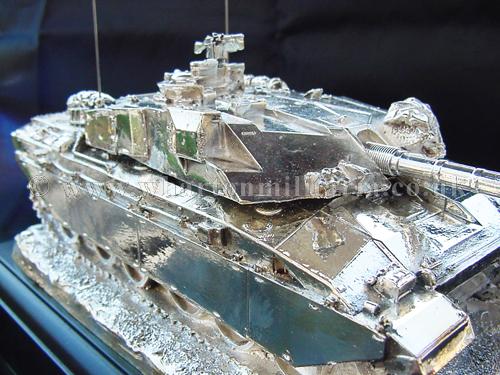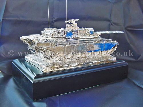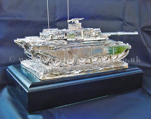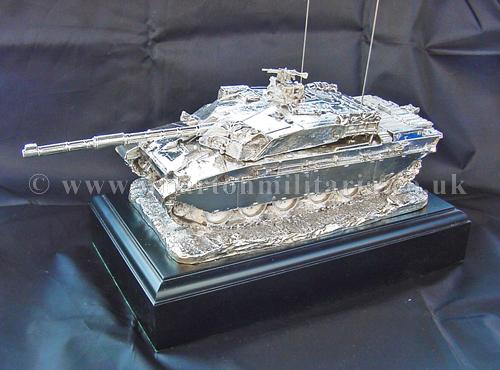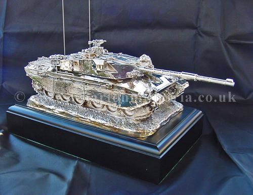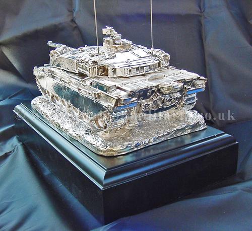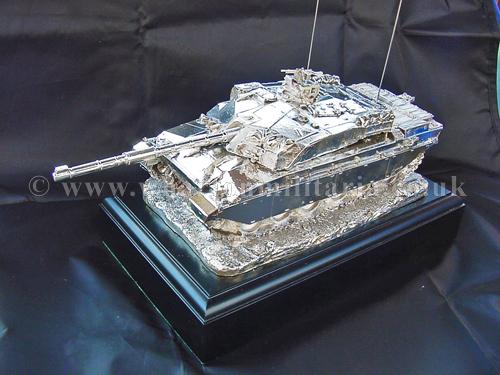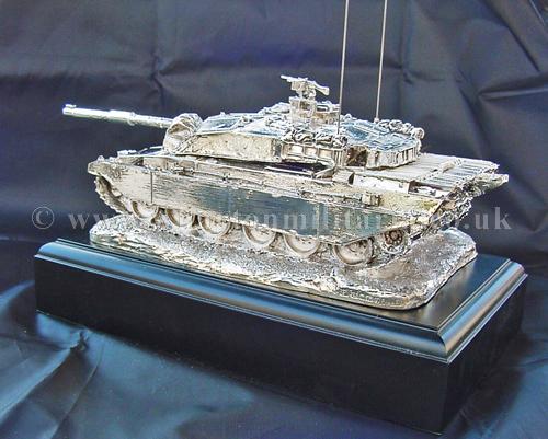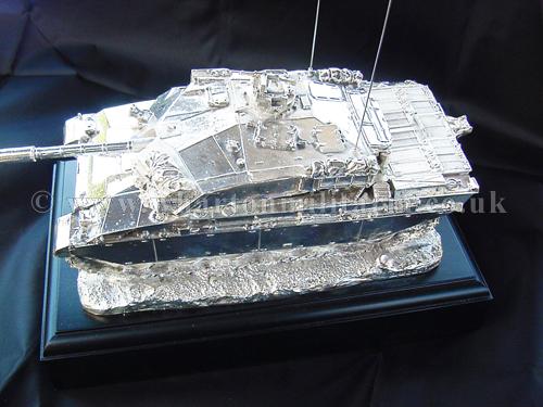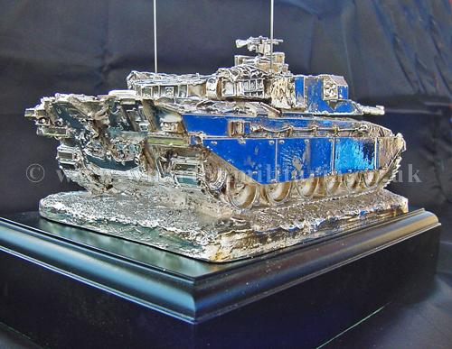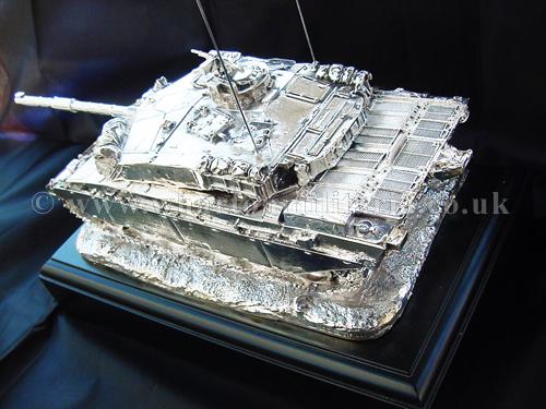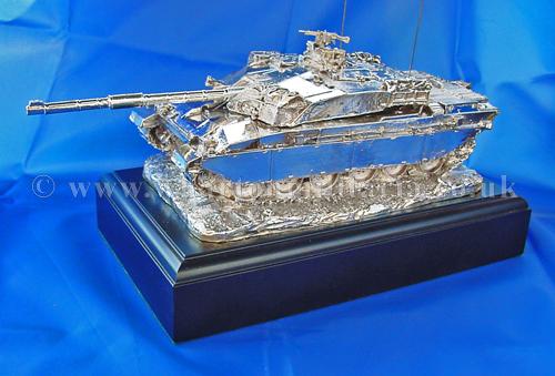 A beautiful hallmarked sterling silver mess table piece of a Challenger 1 tank, this silver model is one of the finest silver Challenger 1 tanks made to date. The tank is an awesome 14 inches approx in length and extremely detailed. This tank was specifically made for the Royal Tank Regiment mess table.