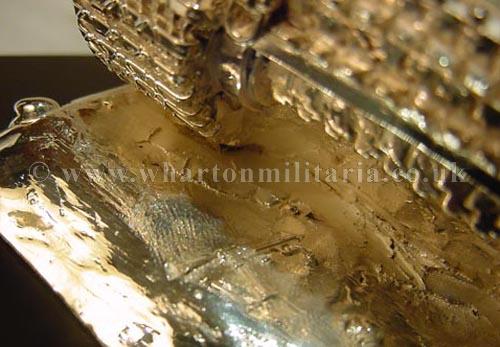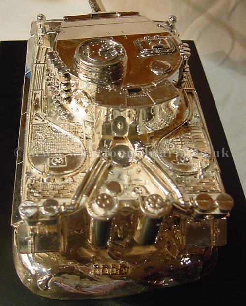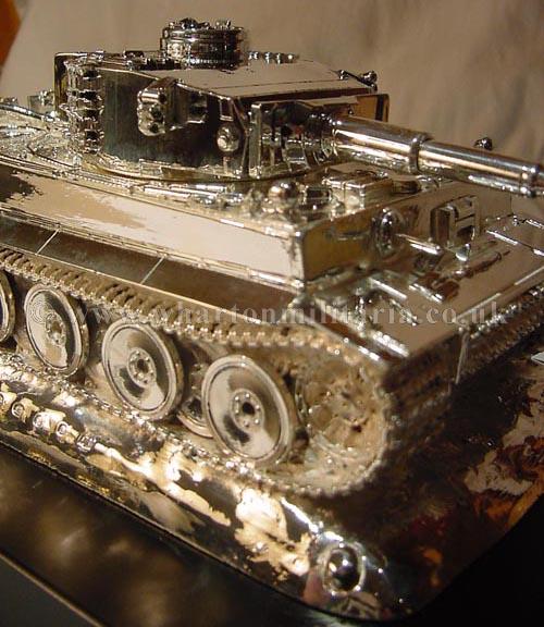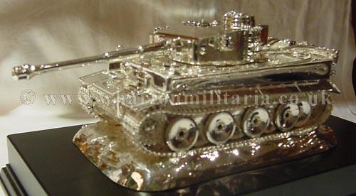 A stunning hallmarked silver WW2 German Tiger Tank. This is a beautiful example of the quality table centre pieces found within the Military Messes. The tank itself measures some 10 inches in length by 5 inches width, standing almost 4 inches in height. On its base it is approx 11 x 7 inches and heavy. This is simply the finest table decoration you can strive to own. The detail on the tank is staggering, it screams out the finest quality yet sits on its plinth in a very understated way, again the sign of true craftmanship, it does not need to say anything, it simply is! The tank is beautifully crafted by hands that are very accustomed to the high quality demanded by both the Officers and Warrent Officers & Sargeants Messes. Silverware like this only graces the finest tables, they are rarely found on the open market as many are passed down through the years within the Mess inventory, or where presented as wedding/leaving gifts by the Mess, they then remain within the families. A beautiful item, not only of a truely German wartime icon but of a grace that is somewhat lacking today, a fine table piece and a sound investment (especially as silver prices continue to soar). Lay your table and eat with the finest! A very detailed and scarce dining table centre piece, very heavy. This is absolutely beautiful and made by the finest silversmiths. Made originally for a German Veterans group. Simply stunning! A fine centre piece for any collection.