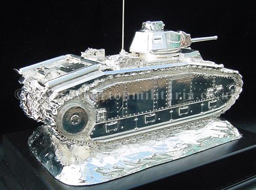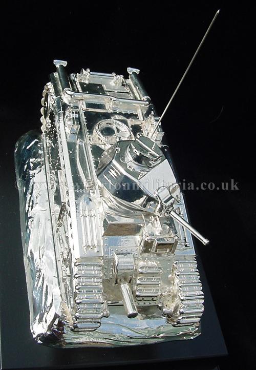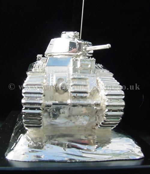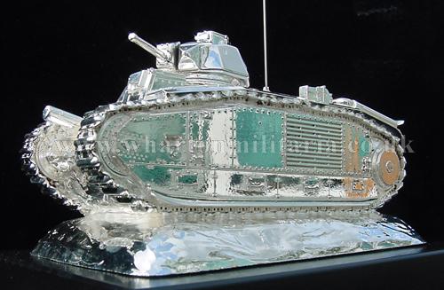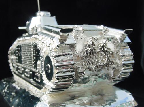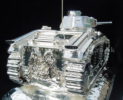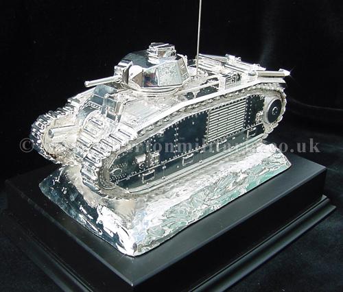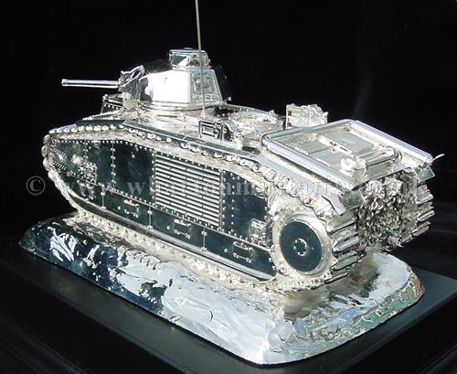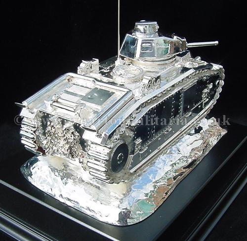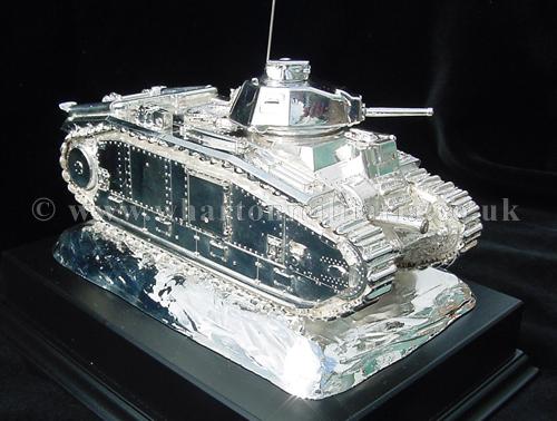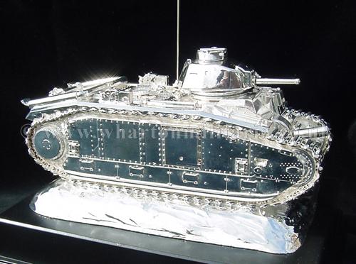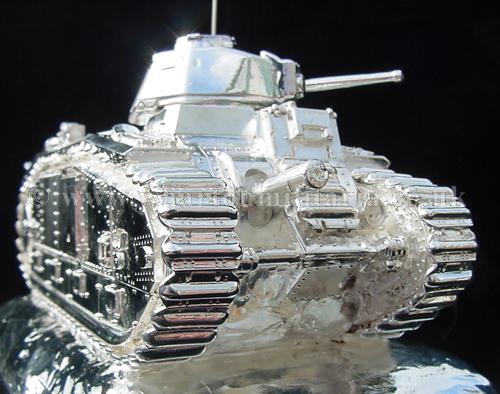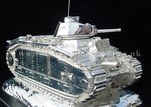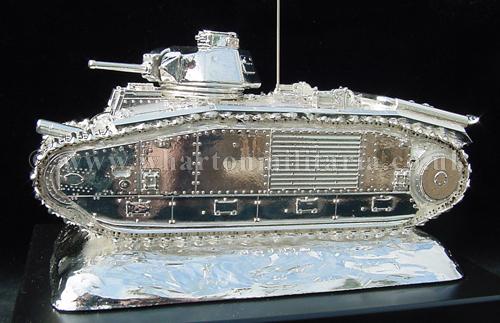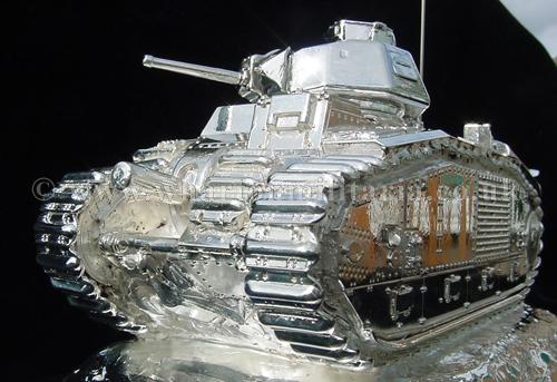 A beautiful hallmarked sterling silver mess table piece of the French Char B1 as used on Jersey during the wartime occupation of the island. The Char B1 was one of seventeen French built Chars used by the Germans during the Occupation. In it’s day the Char B was regarded as one of the most powerful tanks in the world. This silver model is the finest silver Char B1 tank made to date. The tank is an awesome 8 inches by 3 inches approx and extremely detailed. A limited number of Char B1 tanks were made specifically for the table at Government House, Jersey and for the Islanders. This is a truely amazing tank model representing the occupation of Fortress Jersey and of course the only time enemy tanks have ever been on British soil.