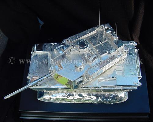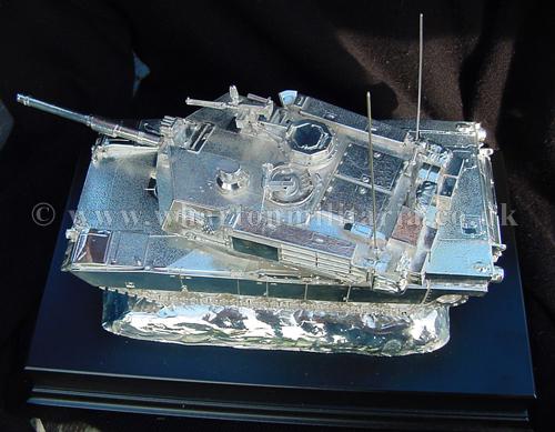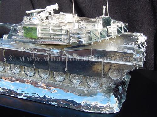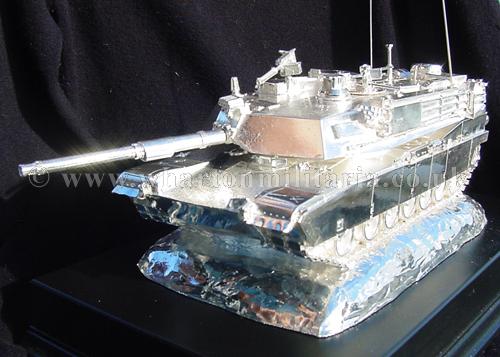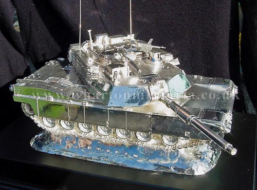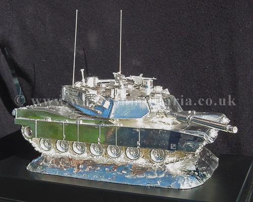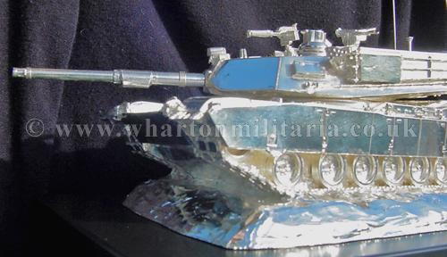 A beautiful hallmarked sterling silver mess table piece of an Abrams tank, this silver model is the finest Abrams tank made to date. The tank is an awesome 14 inches approx in length and extremely detailed, even the non-slip surface shows clearly. A stunning table centre piece for any Abrams crew or veteran, a real eye catcher of quality silversmithing.