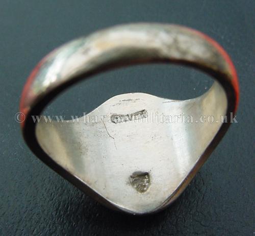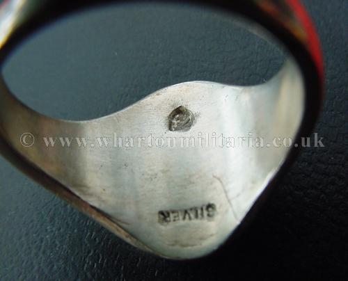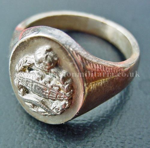 A Royal Tank Corps signet ring in solid silver. The ring face is the RTC cap badge with the right facing tank, plain shank sides, very typical of the period. The ring face shows some minor wear to the tank badge detail. Ring is marked in the rear with 'Silver' and the jewellers mark. Tested as solid silver, will polish up lovely. A very fine and scarce regimental ring.