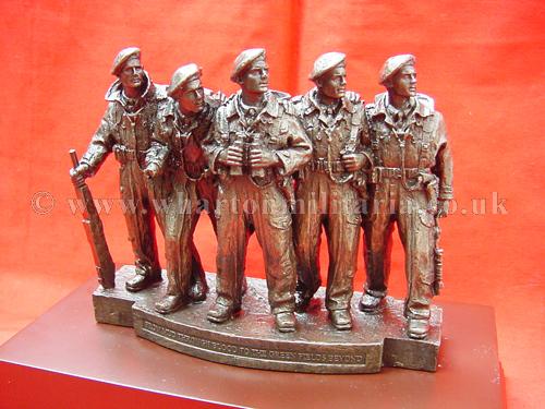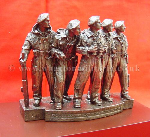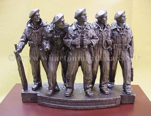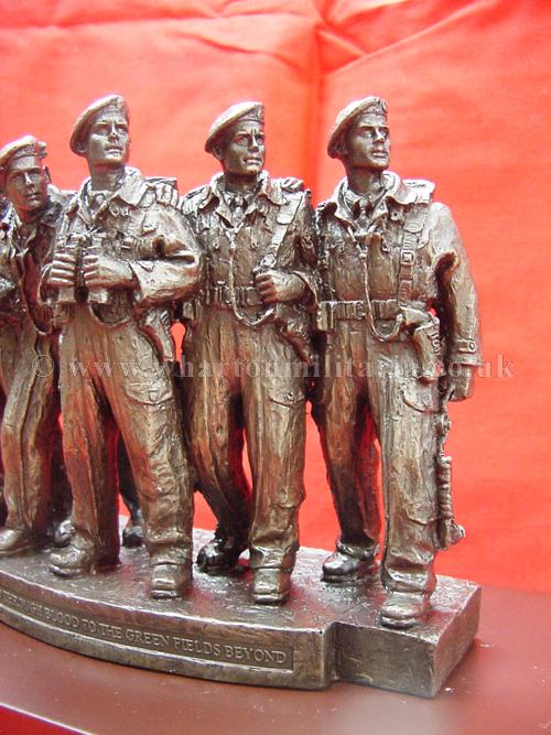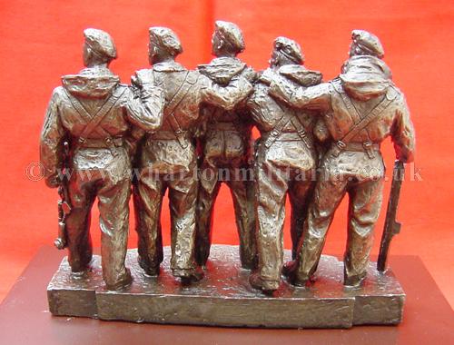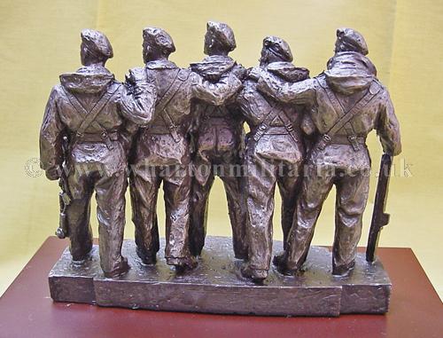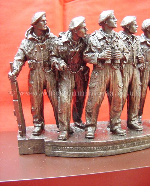 A now very scarce and sought after commemorative statuette of the RTR Memorial Statue of the WW2 Comet 'Tank Crew', as stands in London on the corner of Whitehall Court and Whitehall Place. The statuette approx size is 6.5 x 2 inches and 5.5 inches high, mounted on a plinth approx 9 x 5 inches and 2 inches high. The statuette honours the Tank Crew above the legend 'From Mud through Blood to the Green Fields Beyond'. Really nice, very detailed and heavy, made in cold cast bronze resin. In mint condition having never been displayed. A good opportunity to obtain a scarce and sought after item of Tank Regiment history. The Statue was sculpted by Vivien Mallock and is based on a miniature maquette of a five-man Comet tank crew crafted by George Henry Paulin, the memorial shows the unique comradeship which exists among the men who fight in tanks.