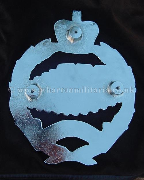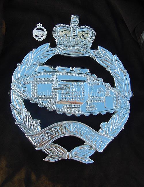 A very rare Royal Tank Regiment wall plaque in a chromed finish for external mounting. This is the only known wall plaque with a top quality chromed finish. It was made as a hard wearing weather protected (i.e. no troopers were required to 'bull it') wall plaque for mounting outside of the Regimental Headquarters building. It is stunning, a real quality piece measuring about 12 inches in height (see cap badge for comparison) that still gleams.