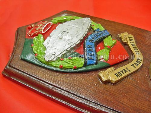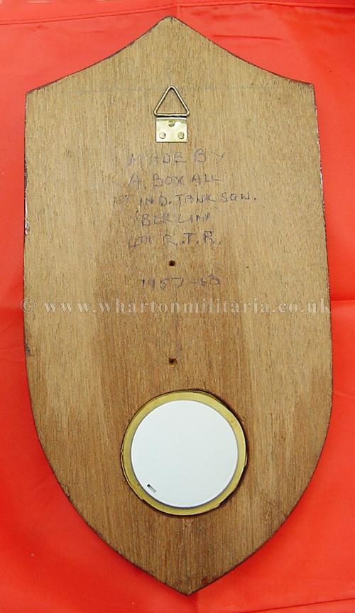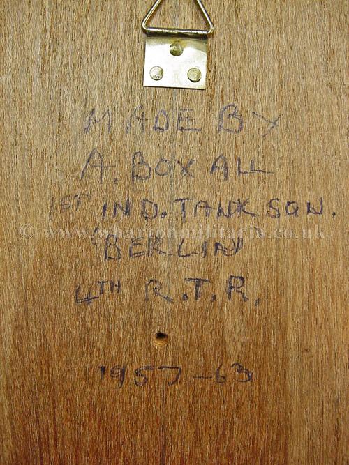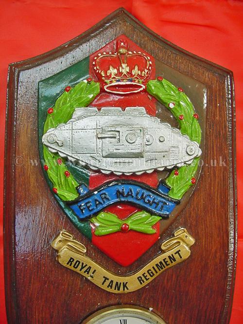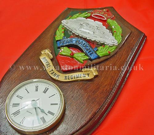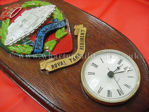 Royal Tank Regiment Clock hand made by 4RTR soldier, a fine wall clock with a hand cast regimental badge and scroll which has been painted in the RTR colours and mounted on a wooden plaque, approx size is 12 x 6 inches, a clock is then fitted into the lower part of the plaque - will need a new battery - the soldier's details are on the reverse. Made whilst 4RTR was in Berlin as the Independent Tank Squadron 1957-63. A nice little piece of tankie history.