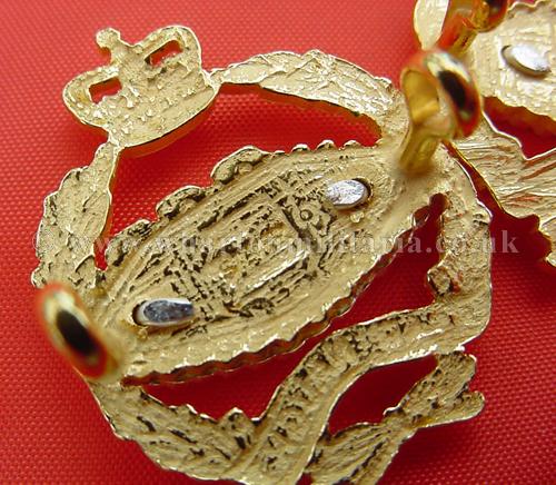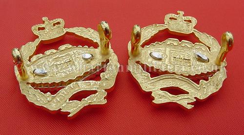 A scarce pair of solid silver Royal Tank Regiment Officer's 2 piece, Queens Crown, collar badges in mint unissued/unworn condition. Beautiful quality, solid silver with gilted wreath and silver tank, stamped 'silver', scarce collar badges not often found in this quality and unworn condition. Suitable for current use.