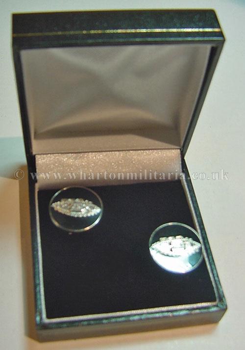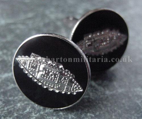 A fine gentleman's cuff-links and tie-clip set to the Royal Tank Regiment. Nicely made, black enamel background approx. 16mm dia. With a WW1 tank in silvered white metal, slightly doomed, looks stunning against evening and mess dress cuffs. Beautifully presented within a felt lined box. Available as either complete set or just the cuff-links. A number of people have been wearing them as sweethearts and blazer/jacket button hole badges. Cuff-links only £20.00, Cuff-links & Tie-clip £25.00