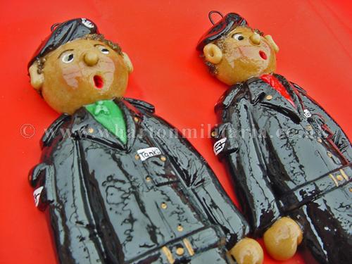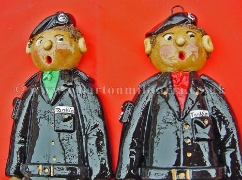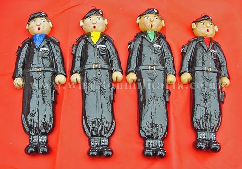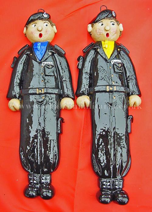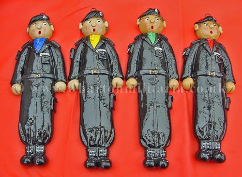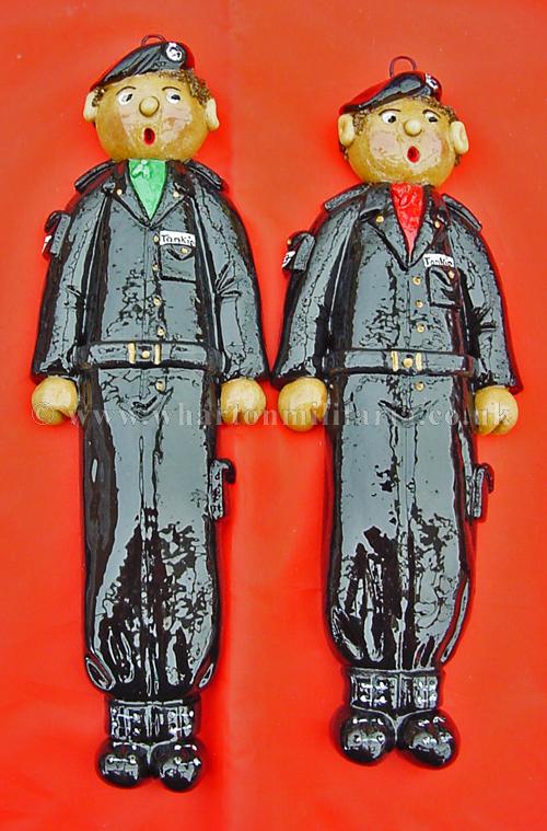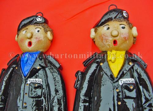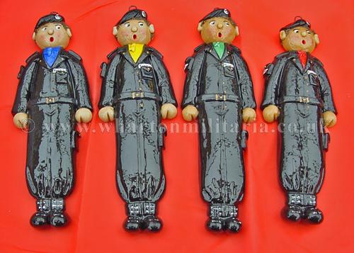 Scarce hand made set of Tankie salt dough figures, circ 1980s, each approx 10 inches tall, made in the rural tradition and individually painted, scarfs reflect the colours of 1RTR, 2RTR, 3RTR and 4RTR, each figure has a hanging loop behind the head, uniforms are the black denims, boots, gaiters, belt, tank arm badge, scarf and beret, real tank park style. Something different for your 'little tankie' or a box frame centre piece for an RTR collection. Very nicely done and cheerful. Price for the four figures.