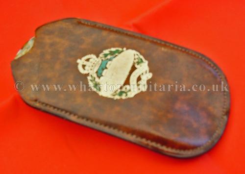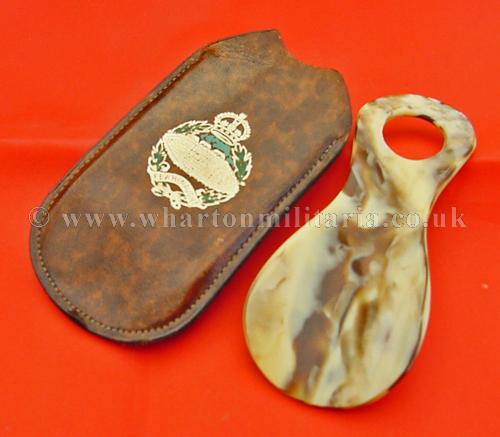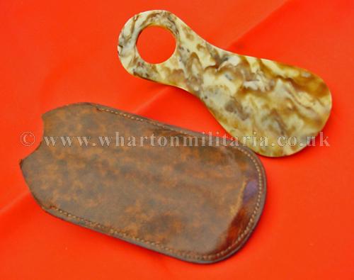 Royal Tank Regiment (RTR) shoe horn, in excellent condition with no sign of wear or use, these were sold within the Regimental Shop during the post war years into the early 50s, the shoe horn is in strong coloured plastic which in turn is housed within a brown leather case with the regimental badge to the front, lovely little tankie collectable with a very practicable use.