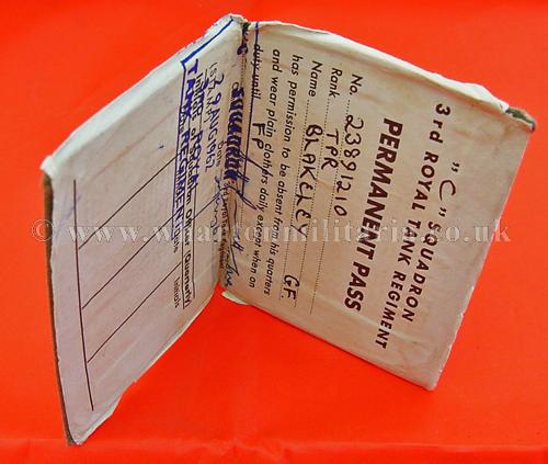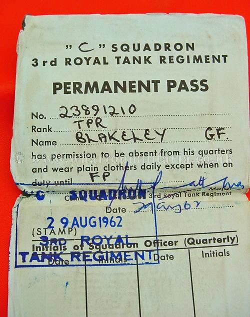 Royal Tank Regiment (RTR) 'Permanent Pass' 3RTR, C SQN, 1962 - so how many of you remember these then? Especially on a cold winters night when the Guard Commander scrutinised every detail of it hoping to find a mistake and have you for being out of camp and in civis too! A nice surviving permanent pass to C Sqn, 3RTR dated August 1962. Sadly not many of these seem to have survived, signed by the Sqn Leader. Excellent little document that all Tankies can relate too, well of a certain age any way.