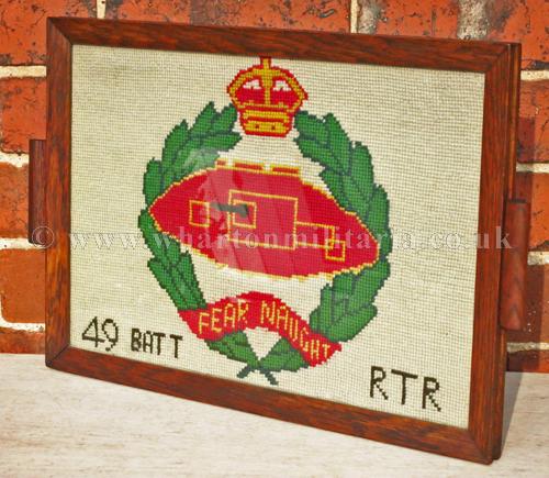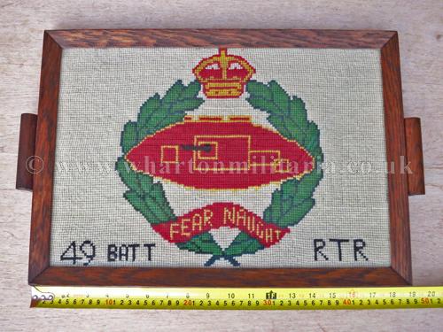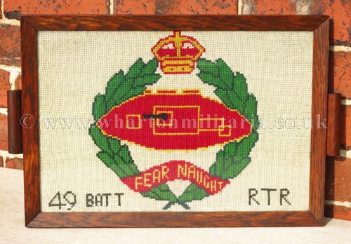 A veteran or sweetheart made tea tray, embroided RTR badge with the '49 Batt RTR' set into a wooden tray with protective top, approx 19 inches wide. In excellent condition overall, a little parting to the base, see images. A lovely RTR homefront item.