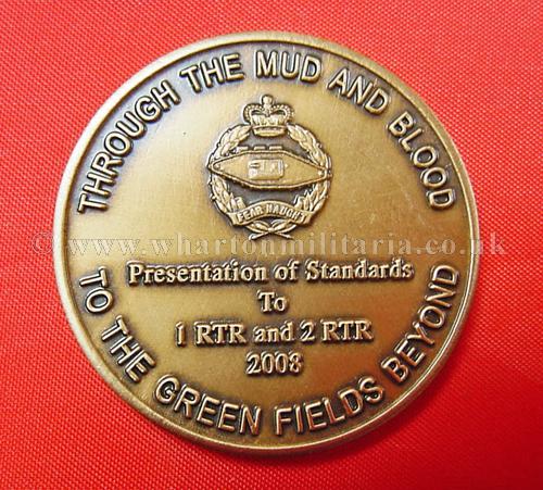 Royal Tank Regiment 'Presentation of Standards' to 1 and 2 RTR in 2008 medallion, in excellent condition, bronze, approx size 38mm dia. Given to serving members of the regiment at the time of the standards presentation, a very nice piece of RTR history.