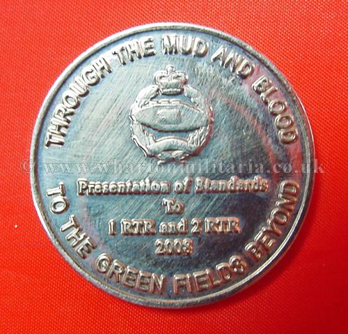 Royal Tank Regiment 'Presentation of Standards' to 1 and 2 RTR in 2008 medallion, in excellent condition, polished white metal, approx size 38mm dia. Given to serving members of the regiment at the time of the standards presentation, a very nice piece of RTR history.