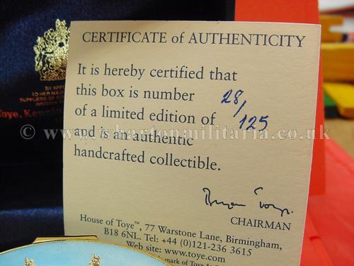 Royal Tank Regiment Presentation of Standards Limited Edition Pill Box by House of Toye, number 28 of 125, within its presentation box complete with its edition certificate, in beautiful unmarked condition. These do not come on to the market often, a nice opportunity for the RTR collector or as a sweetheart gift.