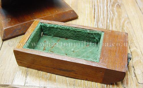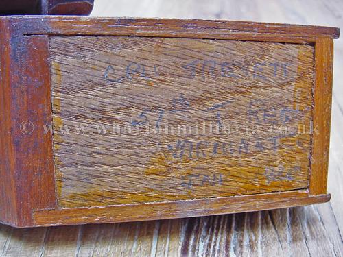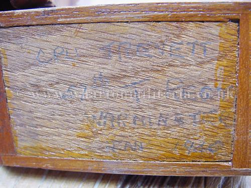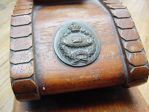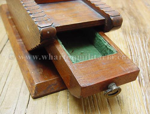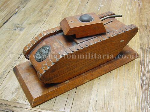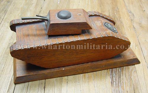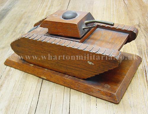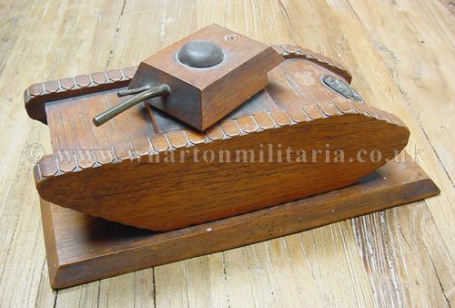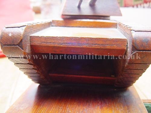 A fine stylised wooden Crusader Tank, handmade with rotating turret, circ 40s, beautifully made with carved track faces, rear of hull has a Royal Tank Regiment officers collar badge, hull mounted on to a plinth, approx size 10x 4.25 inches with a height of 4.25 inches, turrent appears to have once had a bit of wire as an aerial, easily replaced, underneath the hull front is a 'towing eye' which is actually the handle for a hidden drawer, the base of the drawer has the orginal owner or maker's details - appears to be 'Cpl Trevett, 57th T Regiment, Warminster, Jan 1940 - the date certainly ties in with the 57th Training Regiment RAC being based at Warminster before the move to Catterick in 1943. A very interesting and well made model Crusauder tank made almost as they entered service at the beginning of the war by a member of the RAC training team, most likely an RTR tankie on the permanent staff, historical item worthy of further research.