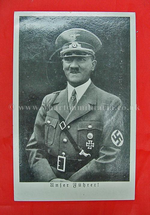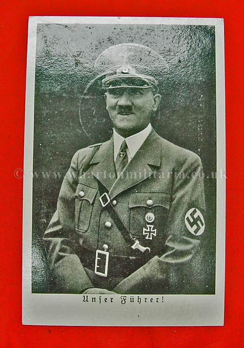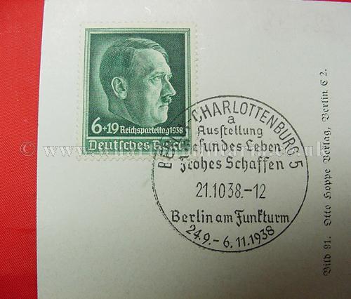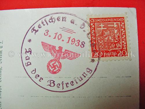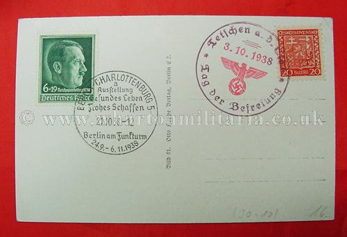 A scarce early NSDAP period postcard of Adolf Hitler in excellent condition, post franked 3rd October 1938 - 'Tag der Befrefung' - Day of Liberation - 3rd Reich entry into pre-war Czechoslovakia, along with the commemorative franking of the Berlin Charlottenburg Exhibition and a Hitler stamp showing him in bust format. A nice clean postcard with two nice commemorative postal franks. These types of franked postcard were bought at events and were able to then be posted at a later time, initially they are like First Day Covers.