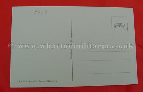 A scarce early NSDAP period postcard of Adolf Hitler in unused condition, circ 1938. Hitler is in uniform, leaning on a wall. A nice clean postcard.