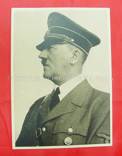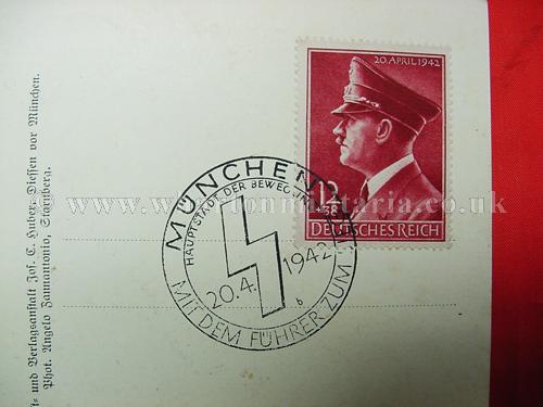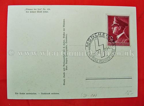 A scarce NSDAP period postcard of Adolf Hitler in unused condition, stamped and postally marked for Hitler's birthday, Munchen city. Hitler is in uniform with his gold party badge showing. A nice clean postcard, these cards were sold on Hitler's birthday to mark the event, they could be posted at a later time.