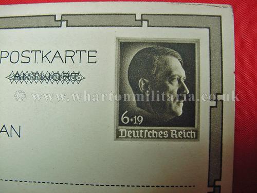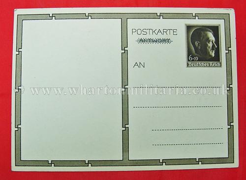 An early NSDAP period postcard of Adolf Hitler in unused condition, circ 1930. Hitler is in double breasted jacket, portrait pose showing NSDAP eagle stickpin on his tie. The rear has a post paid printed Hitler bust stamp, a nice clean early postcard.