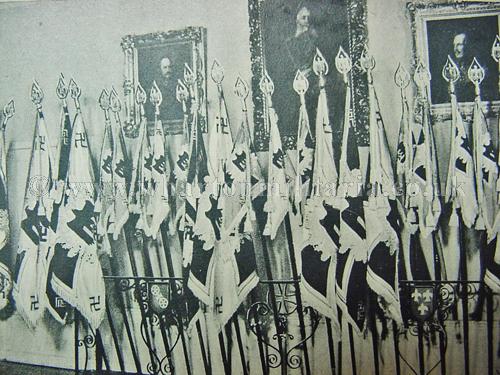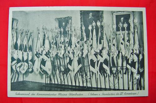 Flags and Standards of the 12th Army Corps postcard, an early period photo-postcard showing the 'standards room' at the Commanders area at Mainz Wiesbaden, postally unused, in excellent clean condition, images of the standards are quite difficult to come across, an interesting and sought after postcard.