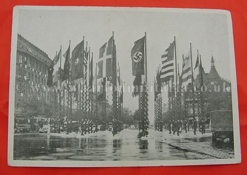 Rare 3rd Reich Period Postcard showing swastika, international and euro-flags in Berlin Charlottenburg, postally unused, early mid 30s, it is unusual and interesting to see the flags of Europe and the USA flying with the NSDAP flag. A scarce card.