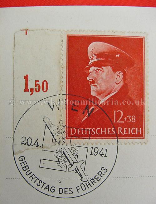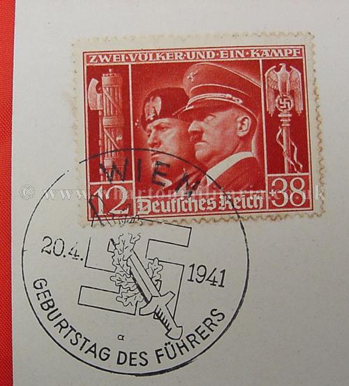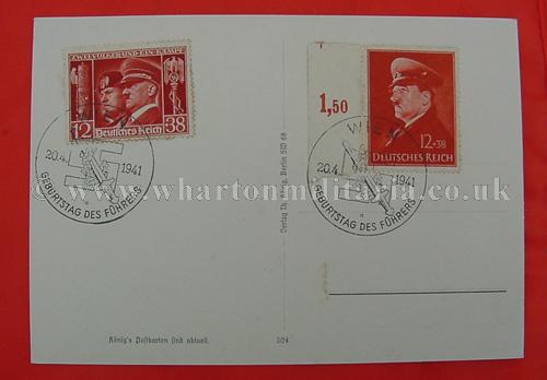 A scarce wartime period postcard of Adolf Hitler in excellent condition, post franked 20th April 1941 - 'Geburtstag Des Fuhrers' along with the commemorative franking of the swastika and sword. There are two postage stamps each with the birthday franking, Hitler and Mussolini wearing peaked caps and Hitler on his own in similar dress. A nice clean postcard with interesting stamps and franking.