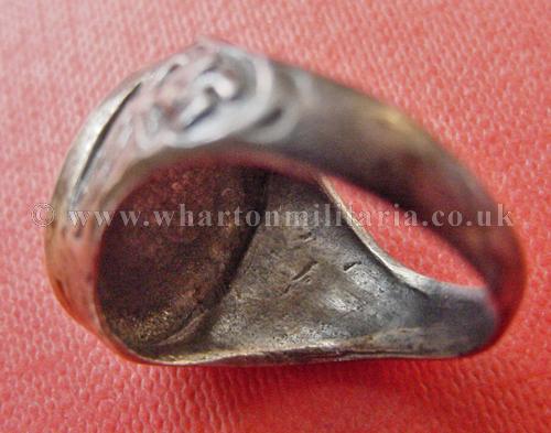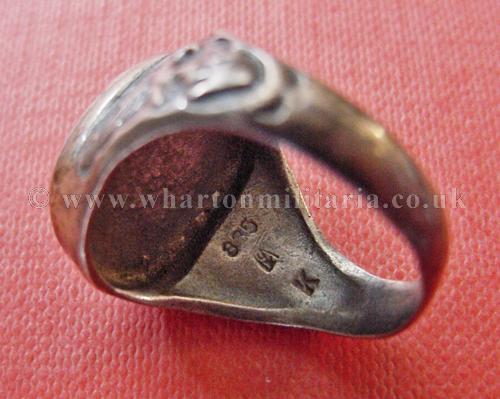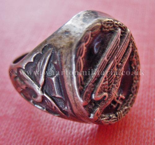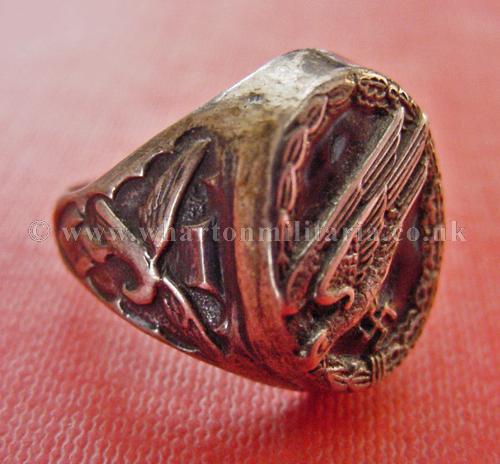 Luftwaffe Paratroopers ring, solid silver and heavy, hallmarked '875 H K', has para badge on top with a black enamel backing, with flying Luftwaffe eagles & swastikas on both sides of the ring shank. Minor wear to sides. Stunning ring, very impressive especially with the black enamel back.