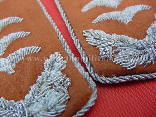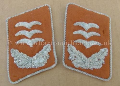 Pair of Luftwaffe Hauptmanns (captains) collar patches in good to excellent condition, on gold brown backing for a member of a signals unit. Patches has some oxidisation to the silver wiring though this does not detract, however, is reflected in the price. Nice pair of collar patches.