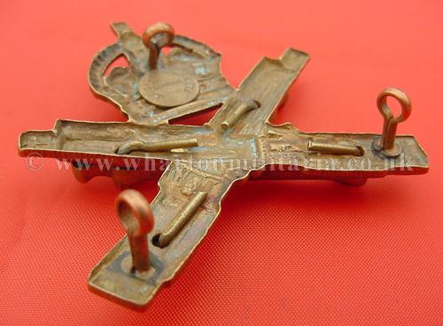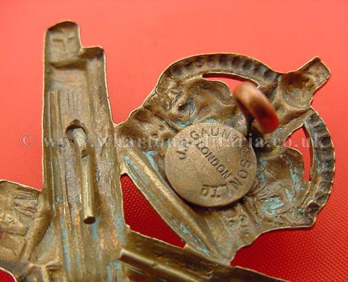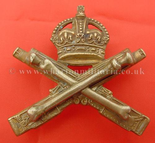 A rare Machine Gun Corps cap badge attributed to the 117th Machine Gun Company, the 117th MG Coy had the crossed bones mounted on to the crossed vickers of their cap badges. This example is made by Gaunt and has the round JRGaunt & Son London plate affixed to the rear of the crown, all three lugs intact, lovely condition with a nice patina overall. One of the hardest badges for the MGC collector to find.