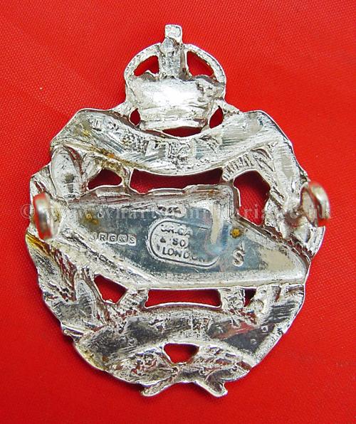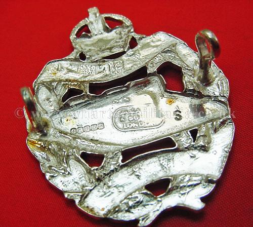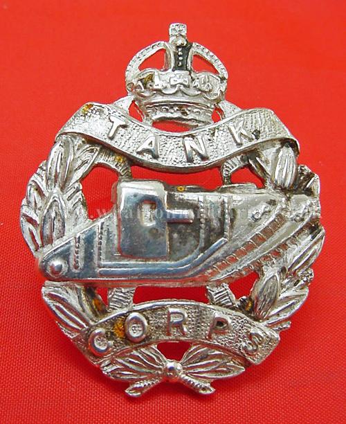 A rare early solid silver Tank Corps Officers cap badge. Badge is marked 'S' plus has the Gaunt hallmark and maker mark, weight 20gm. Badge is in excellent condition, some minor rubbing across the front of the tank from polishing over time otherwise crisp detail. A rare badge. Has been silver dipped to clean off most of the black and dirt.
