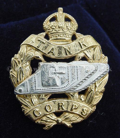 A very nice Royal Tank Corps 2 piece Kings Crown cap badge in mint unissued/unworn condition, fine quality gilted wreath and frosted finish tank, a really nice RTC cap badge, possibly Officers/WOs specification. Scarce in this condition.