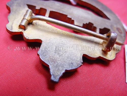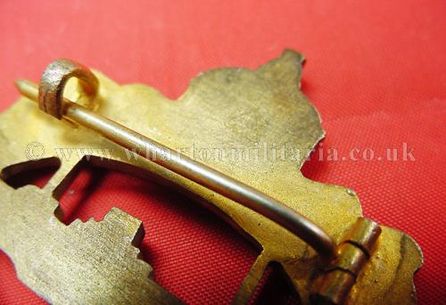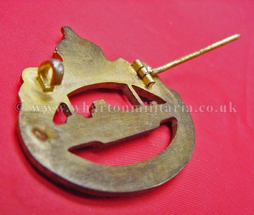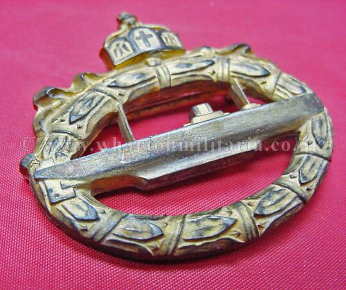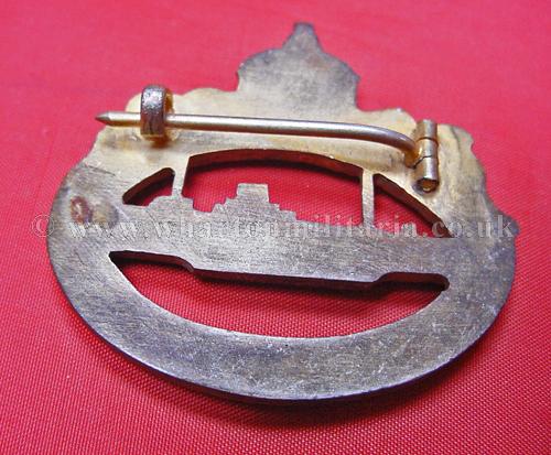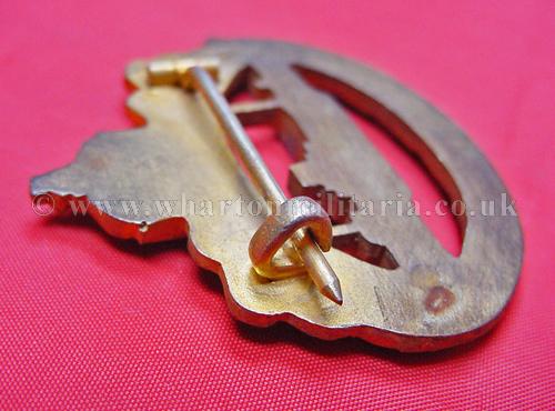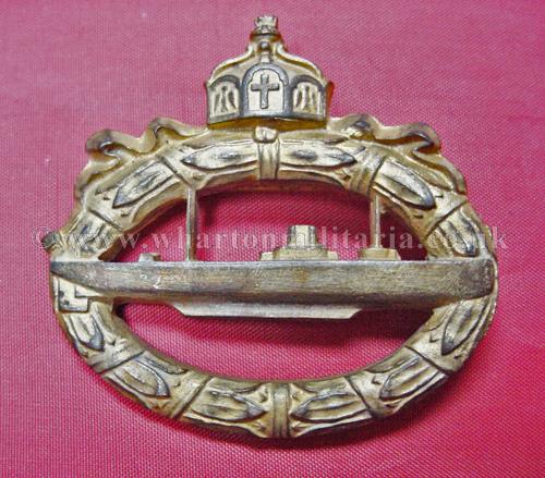 WW1 Imperial German U Boat badge in excellent condition retaining much gilt finish to the front, flat back with needle pin, maker marked behind the imperial crown though difficult to identify. This is a scarce badge.