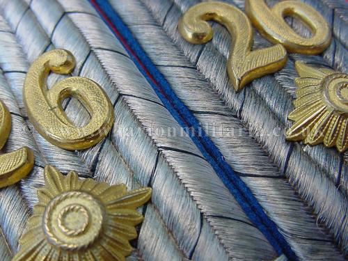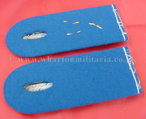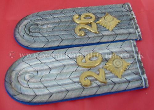 A fine pair of shoulder boards to a Prussian Oberleutnant, of the 1st Magdesburger Regiment Furst Leopold v Sachsen-Anhalt Infantry Regiment 26. Oberleutnant wire tops with gilt metal '26' numerals and pip in the centre mounted on blue backing. Boards are sow in type, have been used though are in excellent condition with no mothing at all. Scarce in such fine condition.